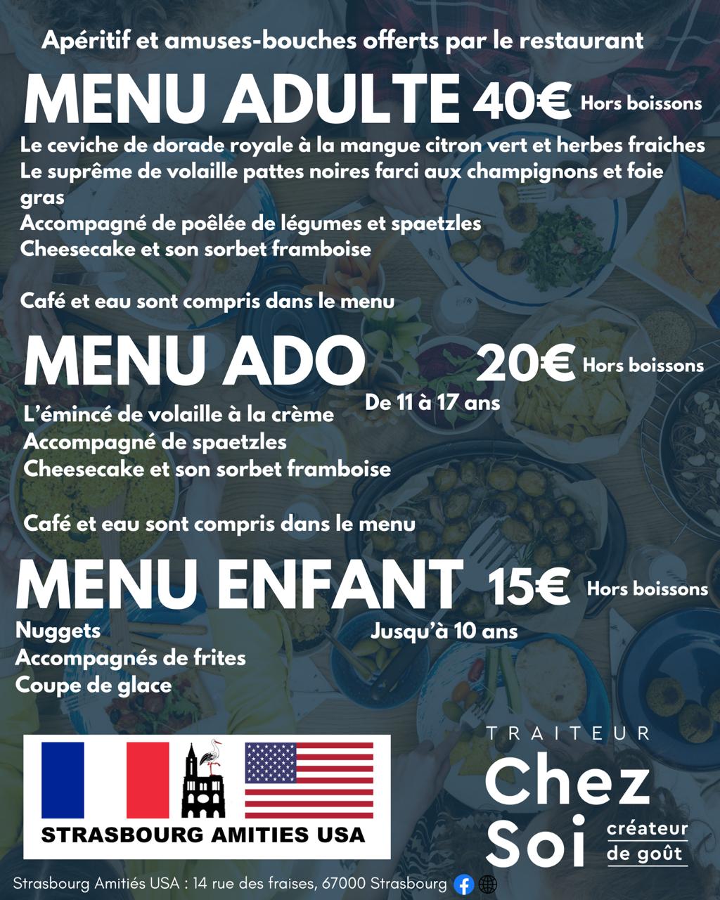 Comme l’année précédente, nous aurons la chance d’être accueillis par le restaurant « Chez Soi », qui a imaginé pour l’occasion des menus spécialement élaborés pour notre événement.